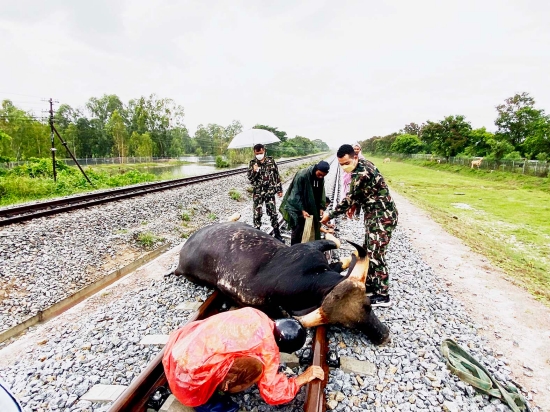 In the area responsible for the Railway (Double Track Railway) in Ban Nong Hin found a male bull, aged 5-7 years, weighing about 1 ton, lying dead on the tracks. Therefore, bring the backhoe to lift the wreck off the rails in order not to harm the train. Before examining the body, there was a serious wound on the right chest area. Bleeding in the mouth and nose. Initially, it was estimated that while the bull was walking on the tracks, it was killed by a train and the train was not damaged and continued traveling until a villager came to find the remains.