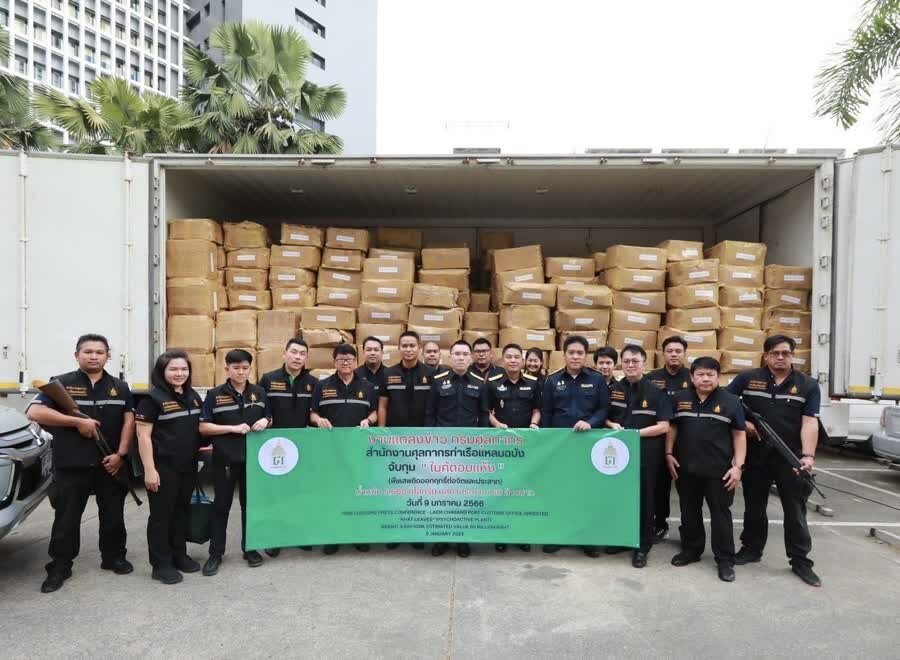 Mr. Patchara Anuntasilpa as Director General of Thai Customs Department, Mr. Pongthep Buasap acting as Principal Advisor on Customs Control Development, Mrs. Nantita Sirikup as Deputy Director General of Thai Customs Department, Mr. Tawal Rodjit as Director of Enforcement Division, Mr. Suradej Trongsirivibool as Director of Laemchabang Port Customs Office, Mr. Varis Visantanon as Expert on Cargo Inspection Techniques, Mr. Prasit Deejongcharoen as Director of Customs Control Section, Mr. Thitiphong khumphuy as Director of Customs Service Section 1 and Mr. Setthawut Chantrawattana as Director of X-Ray and Technology Center, together with officers of Office of the Narcotics Control Board (ONCB) from Ministry of Justice, and the Narcotics Suppression Bureau from the Royal Thai Police held a press conference to reveal the seizure of 5,600 kg of dried Khat leaves, a psychoactive plant, valued at 60 million Thai Baht.