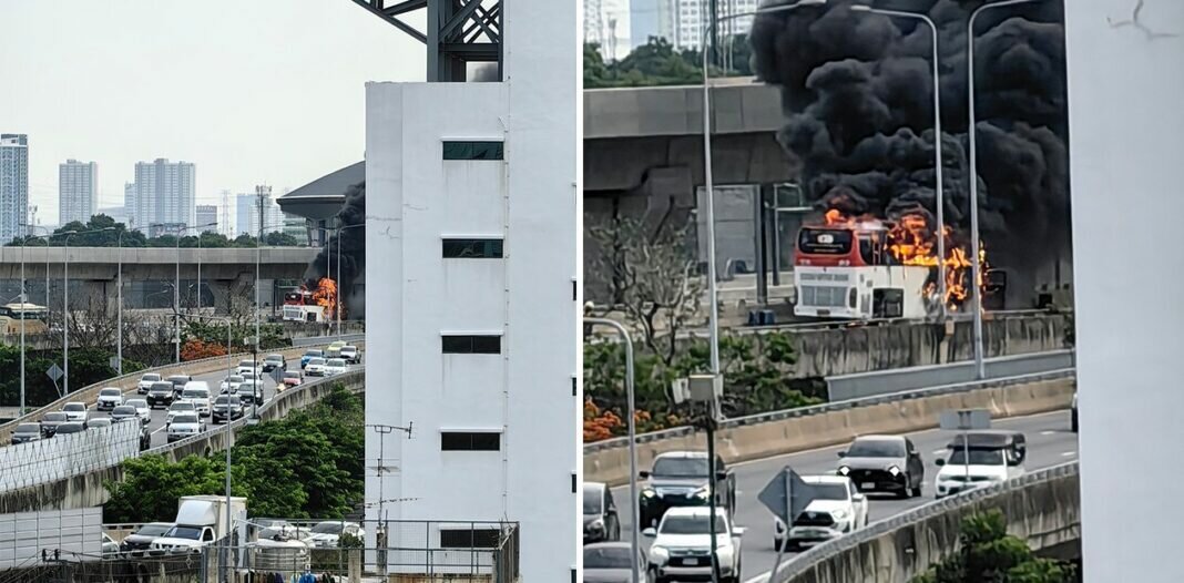 The incident took place at approximately 8:17 a.m., when Pol. Lt. Col. Krit Limchamroon, Deputy Superintendent (Investigation) of the Expressway Police Station 2, received a notification from the 199 hotline and the expressway rescue workers regarding a bus fire. Responding swiftly, a fire truck from the Bangkok Disaster Prevention and Mitigation Bureau was dispatched to the scene, located before the entrance to Kamphaeng Phet 2 Road.