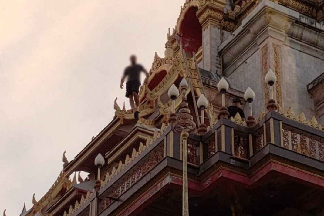 In a gripping incident that unfolded on July 7, 2023, a foreign man captured the attention of onlookers as he climbed atop the roof of the renowned Phra Mahathat Chedi in Chaitararam Temple, also known as Chalong Temple, located on Chao Fa Tawan Tok Road in Chalong Subdistrict, Mueang Phuket District.