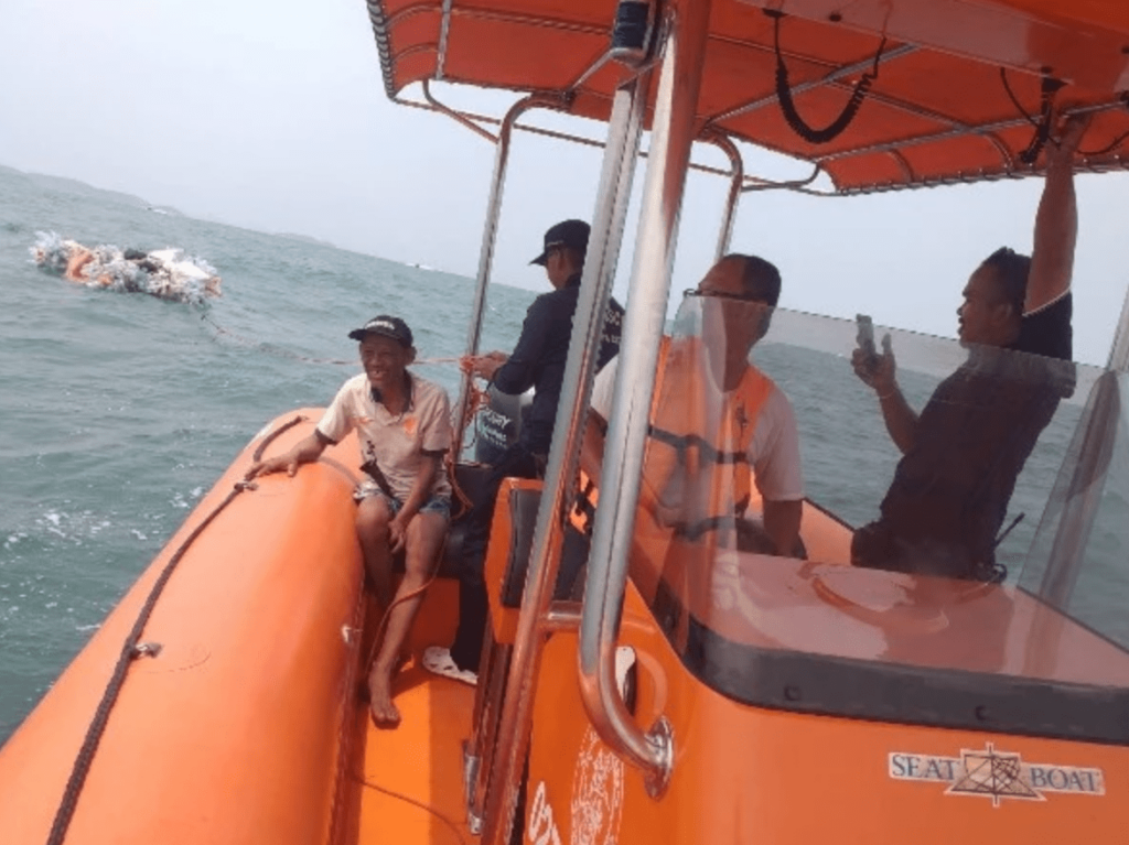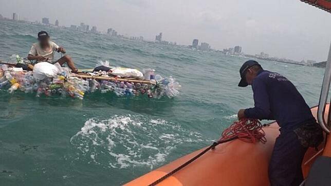 In the coastal town of Sriracha, a compelling tale unfolded as the recent “Taloy” phenomenon, where individuals navigate the seas on makeshift rafts, took an unexpected turn. Today, “Uncle Somkiat,” a 53-year-old resident of Nakhon Phanom, found himself at the center of attention as he bravely attempted to traverse the Gulf of Thailand on a plastic bottle raft, seeking the serene shores of Koh Larn. However, his courageous journey faced a formidable challenge when strong winds veered him towards the treacherous waters, leading to a perilous situation that prompted a swift rescue operation.