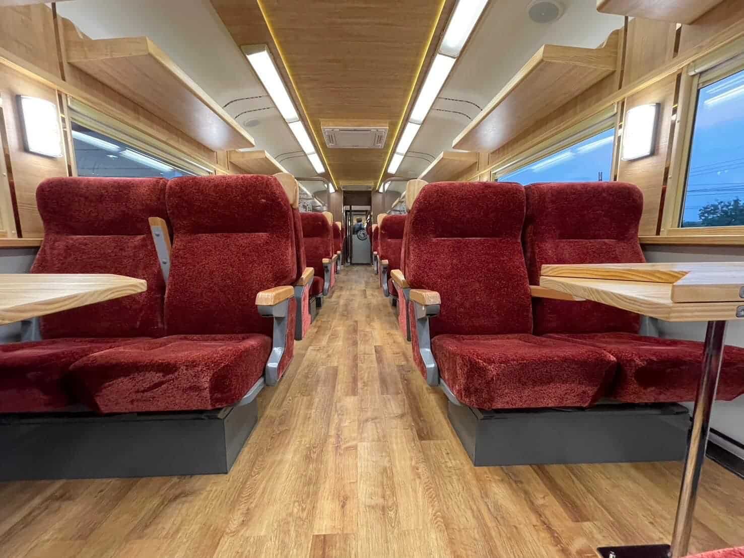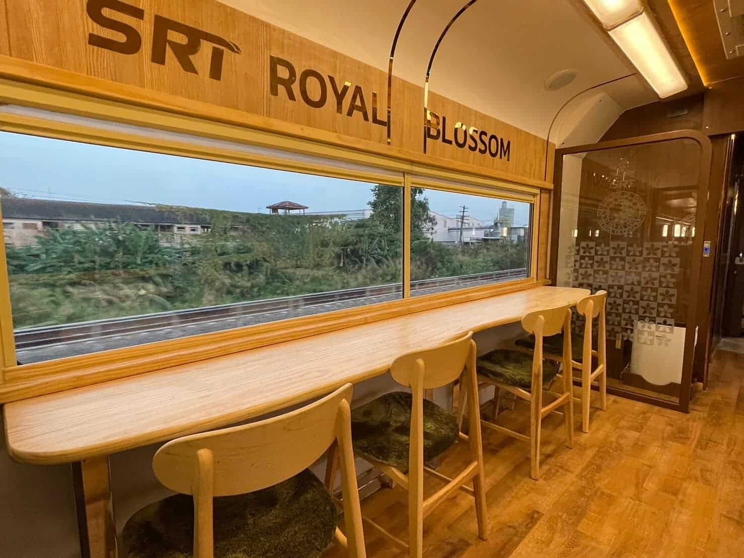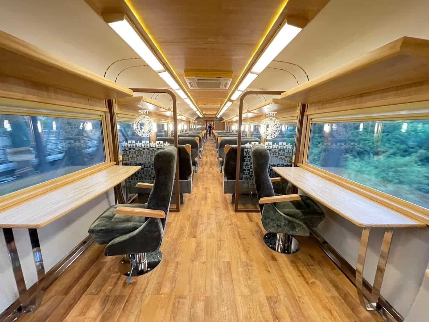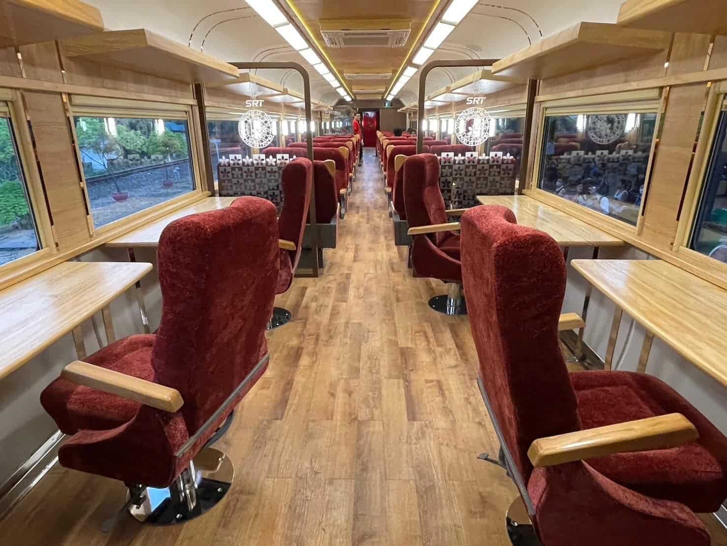 Externally, the Royal Blossom coaches are adorned with a cherry red and gold livery, reminiscent of cherry blossoms, symbolizing the uniqueness of this tourist train. The carriages feature a distinctive logo, “State Railway of Thailand Royal Blossom since 2022,” accompanied by the Royal Crown flower, denoting a new era of travel.