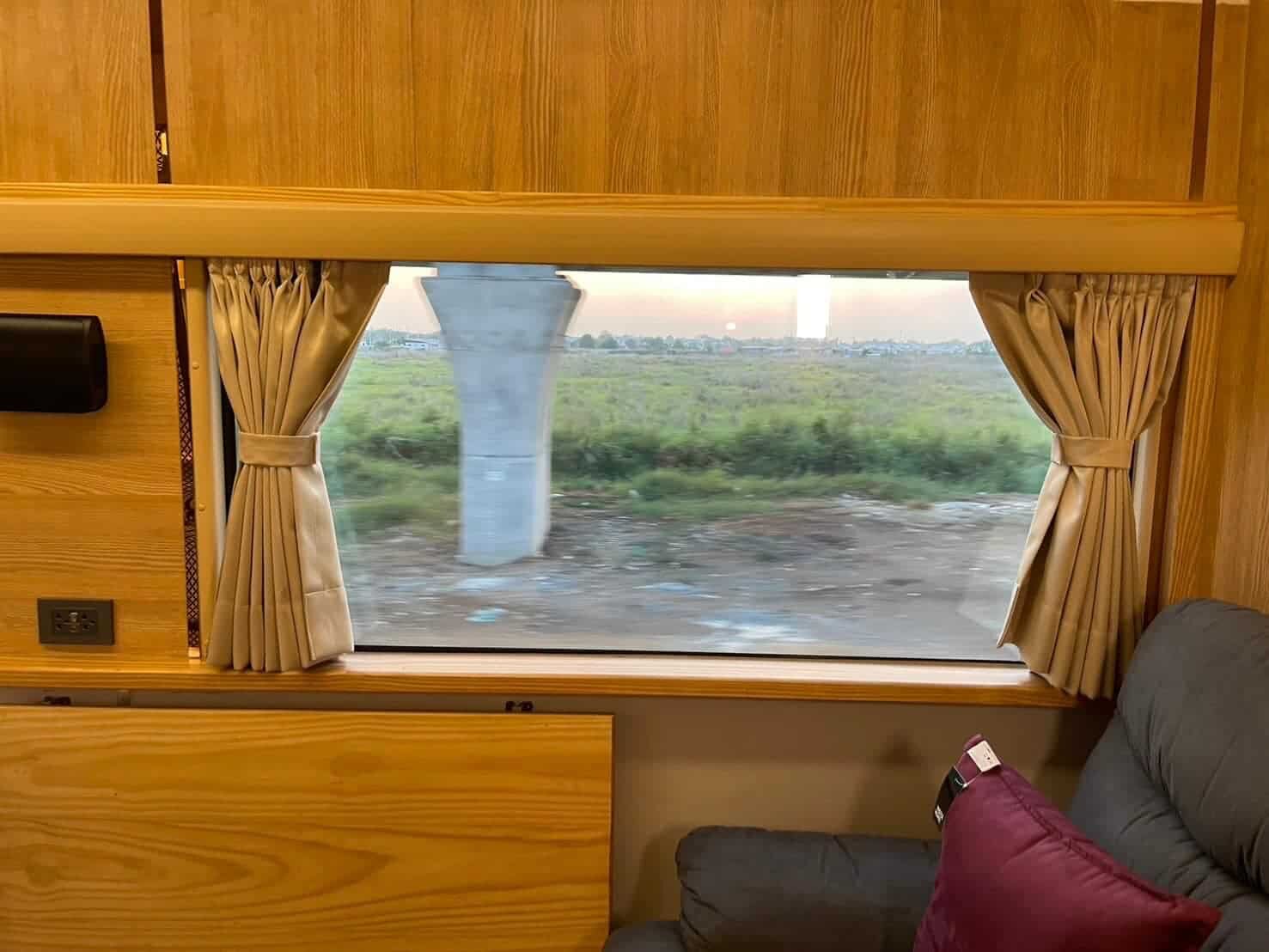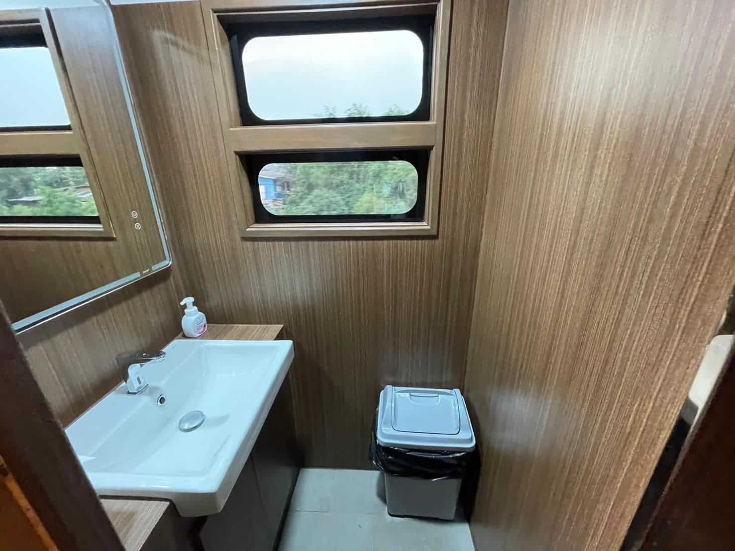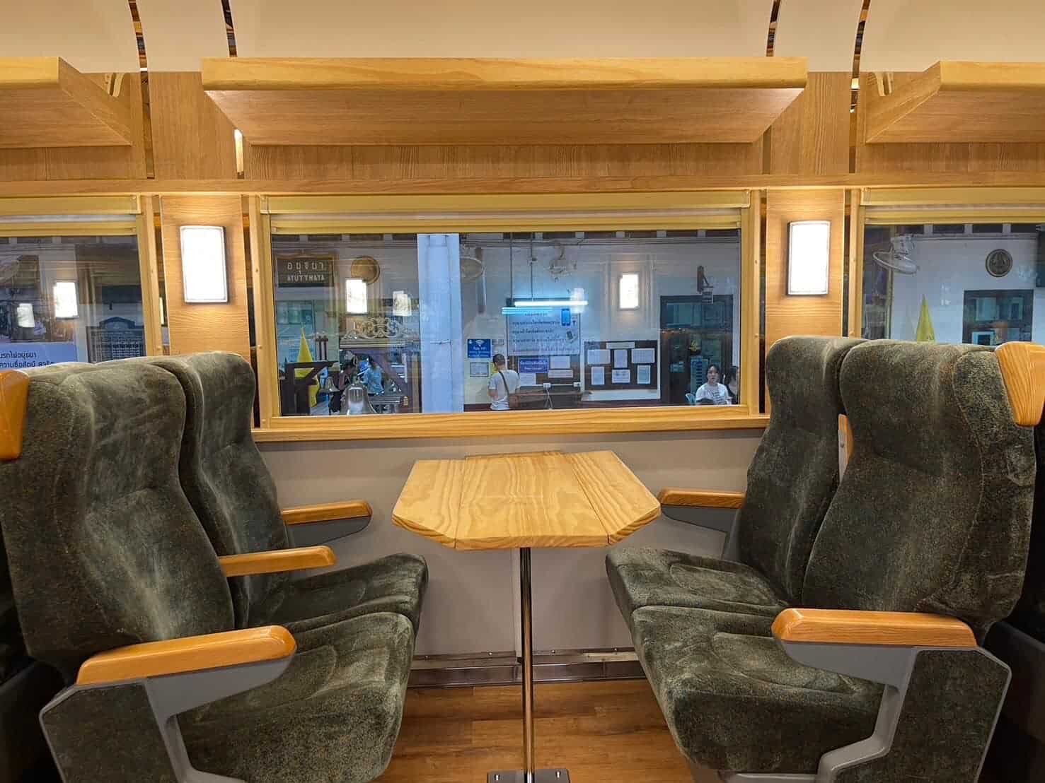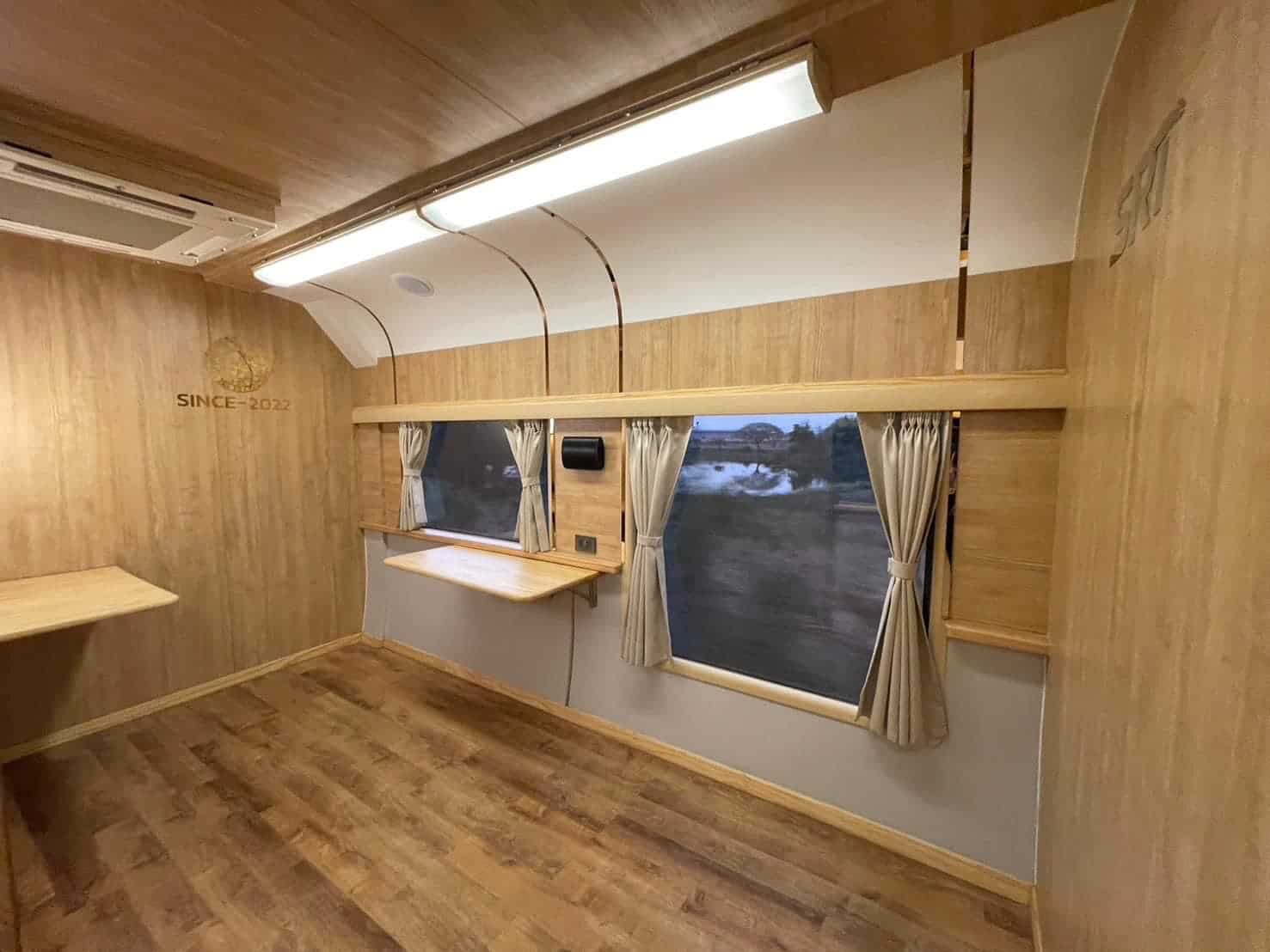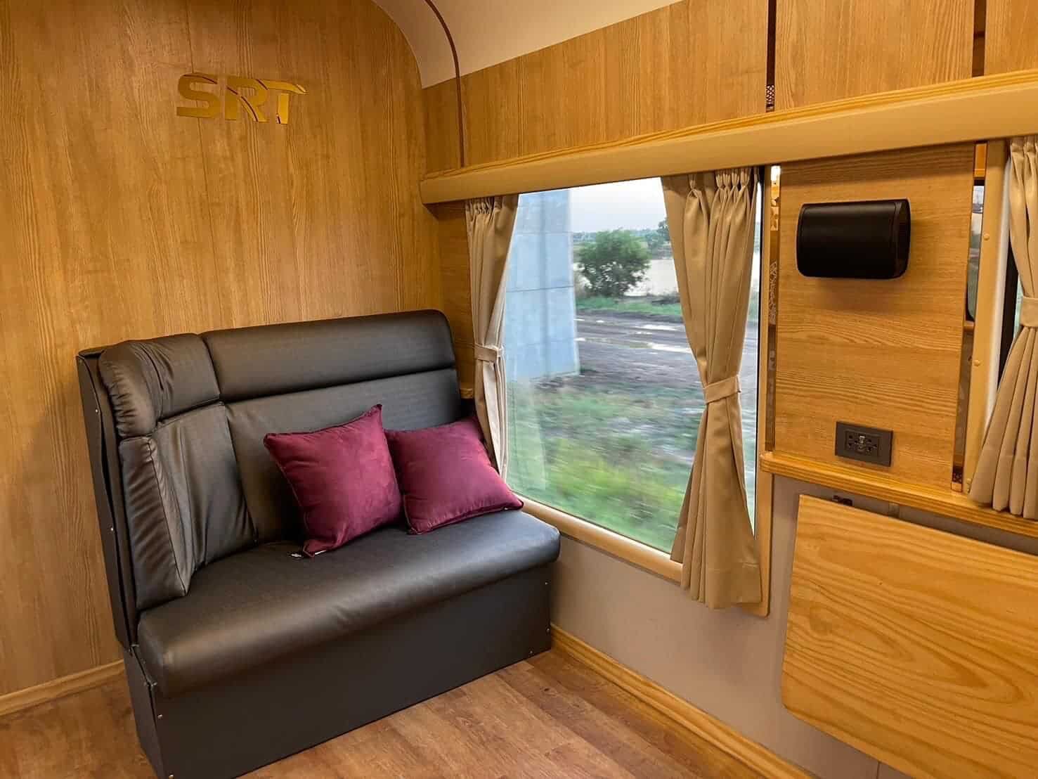 Externally, the Royal Blossom coaches are adorned with a cherry red and gold livery, reminiscent of cherry blossoms, symbolizing the uniqueness of this tourist train. The carriages feature a distinctive logo, “State Railway of Thailand Royal Blossom since 2022,” accompanied by the Royal Crown flower, denoting a new era of travel.