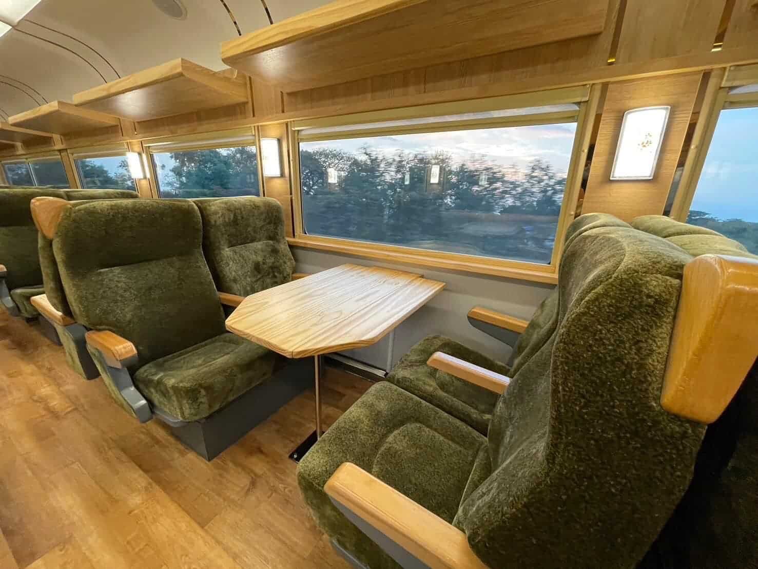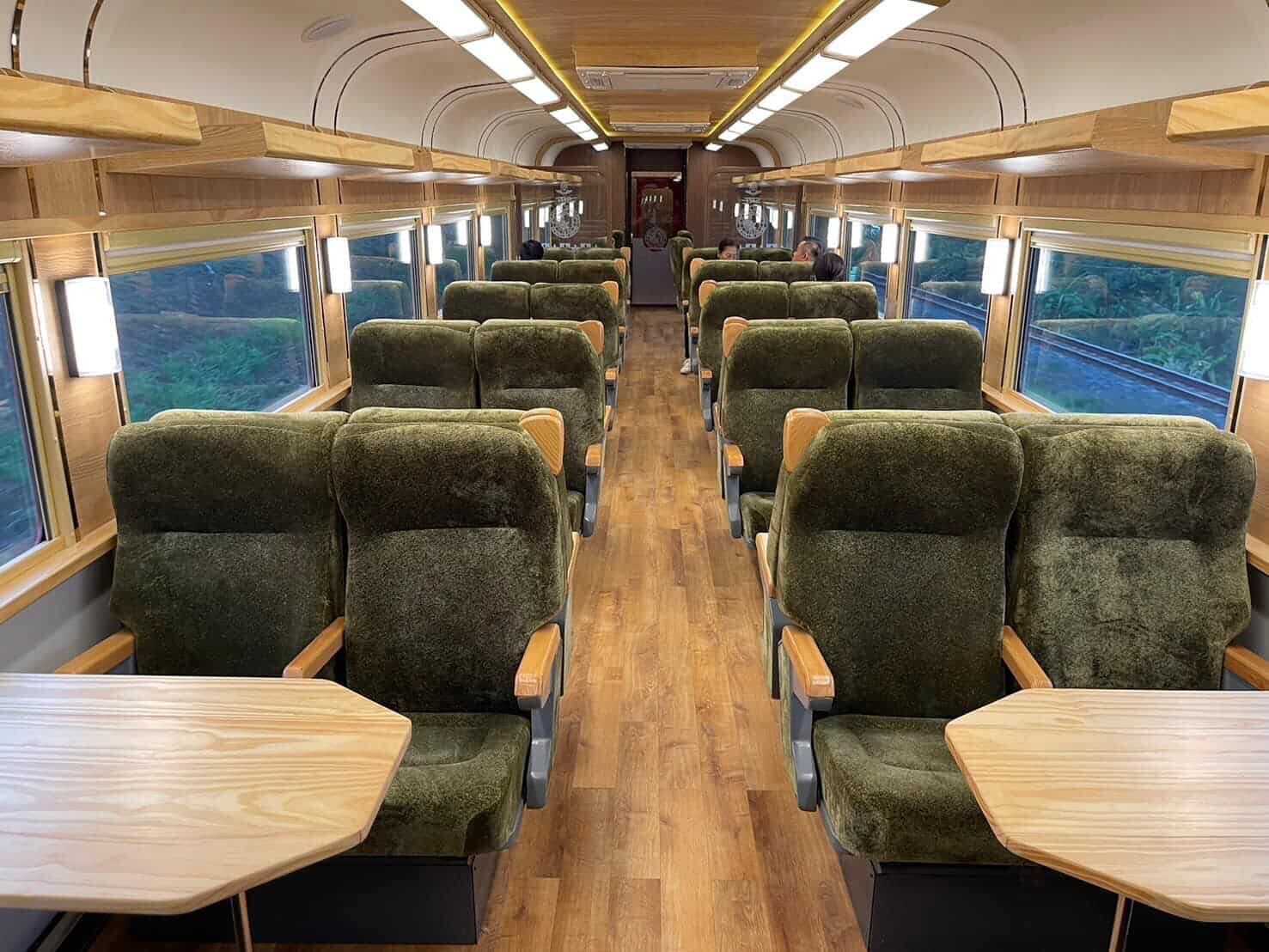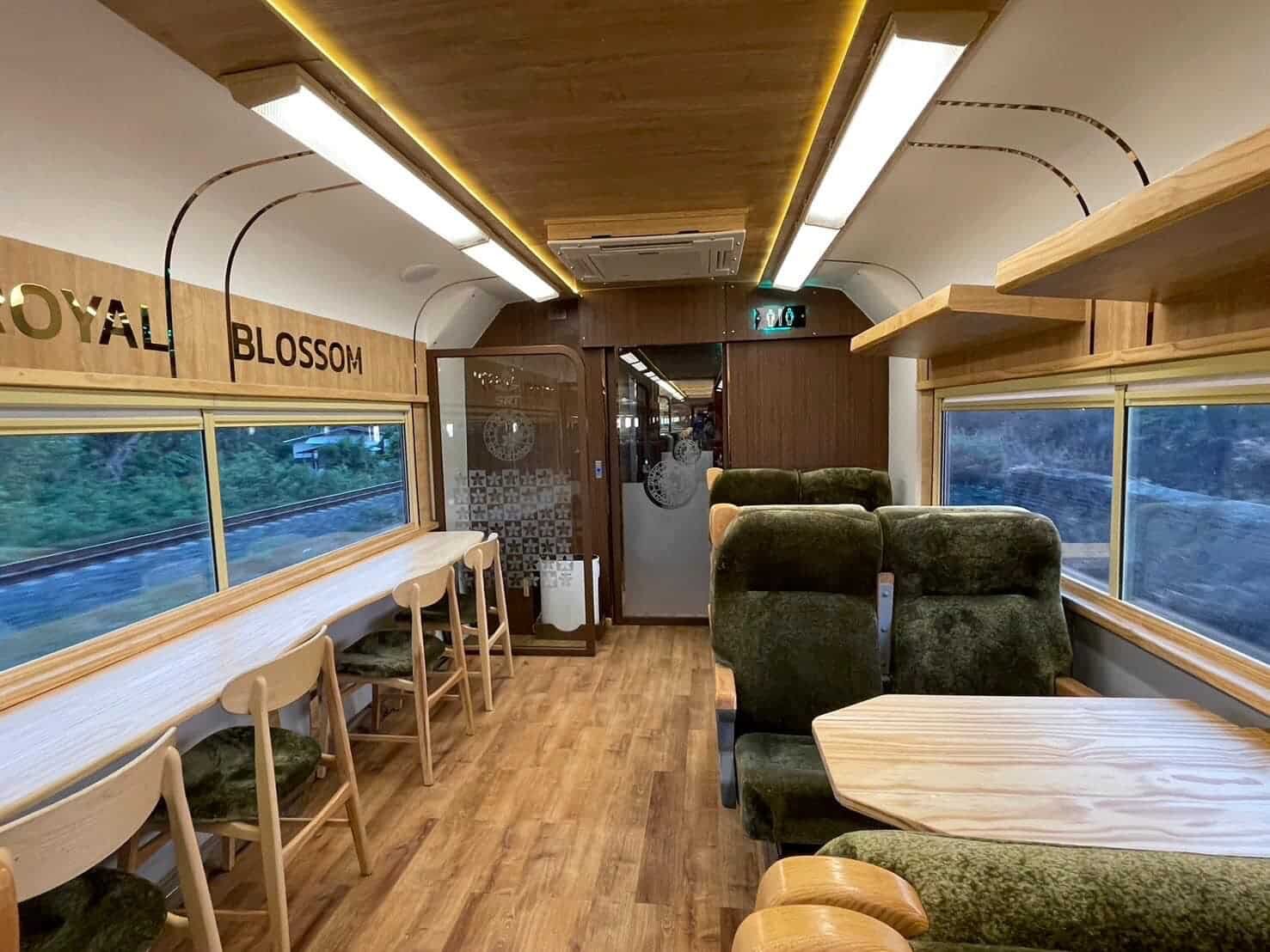 The five Royal Blossom carriages are segmented into a Group Car, accommodating private group travel, and three Passenger Cars, offering a mix of forward-facing and group-oriented seating arrangements, each with USB charging ports. Additionally, there are eight separate seats for those seeking privacy.