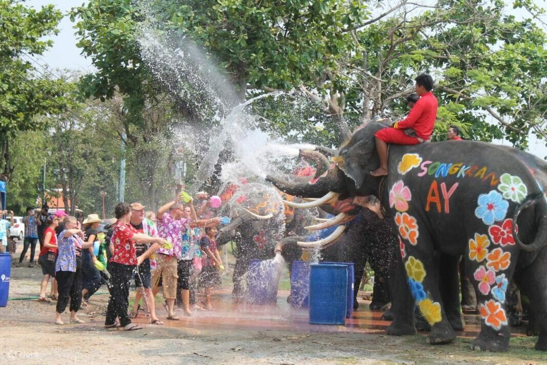 In the heart of Ayutthaya, a spectacle unfolds as elephants adorned in vibrant hues join in the jubilant water splashing festivities, signaling the commencement of the Songkran Festival. The ancient city reverberates with joy as locals and tourists alike gather to partake in this cherished tradition.