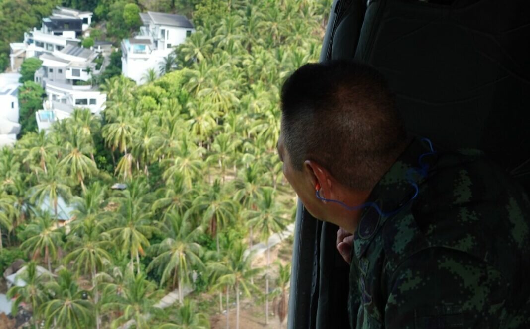 After receiving a mission briefing from the inspection team, Lt. Gen. Santi embarked on a survey of the target areas around Koh Samui. Accompanied by Mr. Suriya Madi, Permanent Secretary for Koh Samui District Administration, and Mr. Charan Rueanphanit, Head of the Forest Protection Unit, Sor.16, the inspection aimed to gather factual information to take decisive legal action against violators.