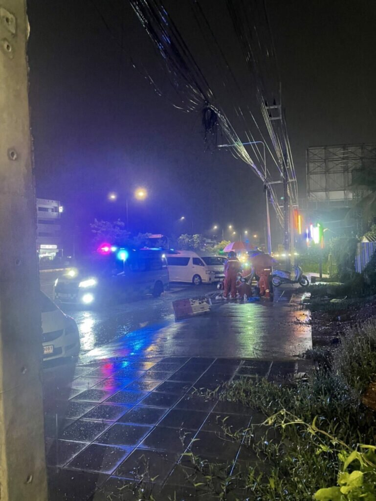 Rescuers found Mrs. Somchit lying on the sidewalk with a broken left eyebrow and pain in her right leg. They administered first aid before transporting her to Pak Kret 2 Hospital. Villagers had attempted to prevent further accidents by placing iron poles over the uncovered drain. Miss Yupha, Mrs. Somchit’s 63-year-old sister, explained that a miscommunication with a taxi driver had left them needing to call another taxi, during which time Mrs. Somchit, feeling unwell, walked towards the sidewalk and fell into the drain.