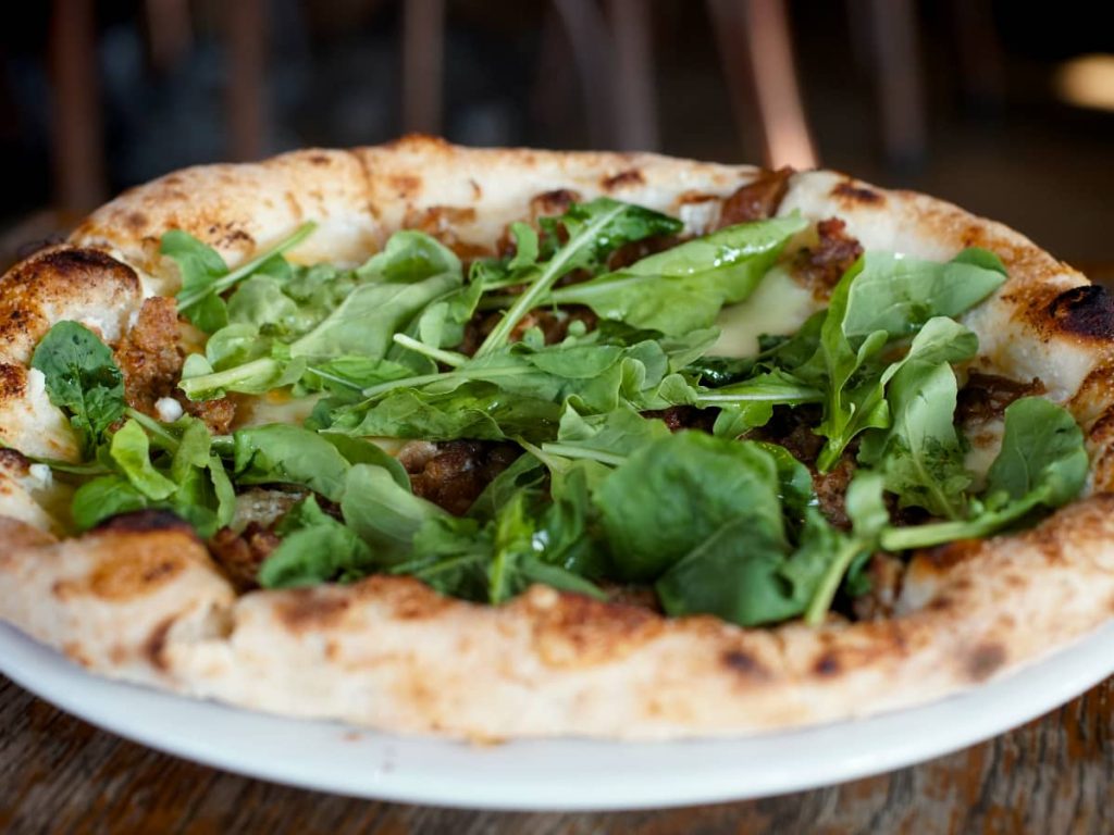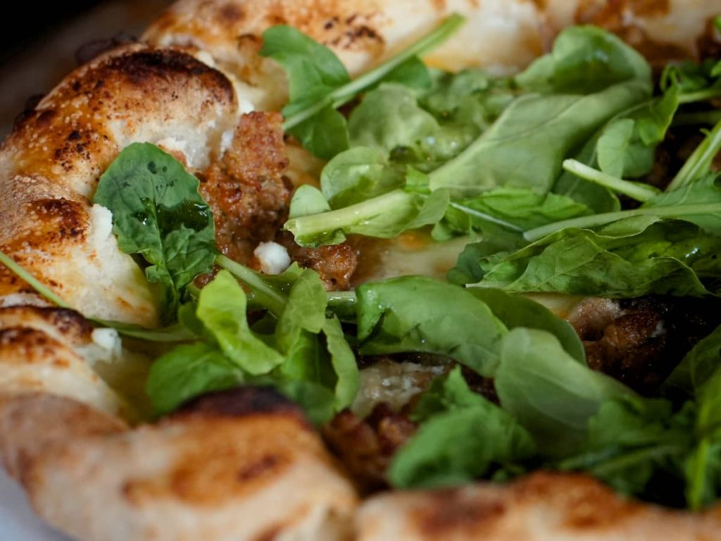 The Italian Sausage Pizza offers a hearty and savory experience, deeply rooted in Italian-American culinary tradition. The Italian picante sausage, seasoned with a precise blend of fennel seeds, garlic, and red pepper flakes, brings a distinct flavor profile that pairs harmoniously with the combination of the ricotta cheese, sweet caramelized onions, mozzarella cheese and peppery rocket leaves. This pizza is a celebration of robust flavors, appealing particularly to meat lovers who appreciate the rich, aromatic qualities of well-seasoned sausage.
