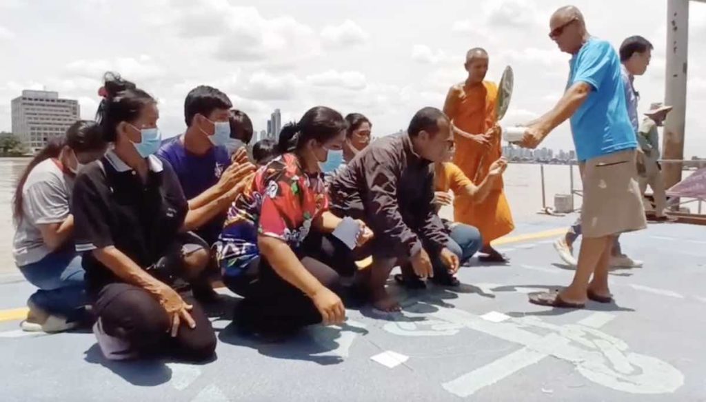 Mongkolsawat Wernkratok, 48, the surviving passenger from the tragic collision, brought the body of his wife, Pariyat, back to her hometown in Nong Muang District, Lopburi Province, to perform funeral rites. The atmosphere at the ceremony was filled with profound grief, with family members, particularly Pariyat’s mother, Saowapha, 65, and her two younger sons, mourning deeply as they performed the bathing ritual for the deceased. The family also invited monks to the pier at Wat Bang Kachao Nok to perform a ritual to call back the spirits of the two victims.