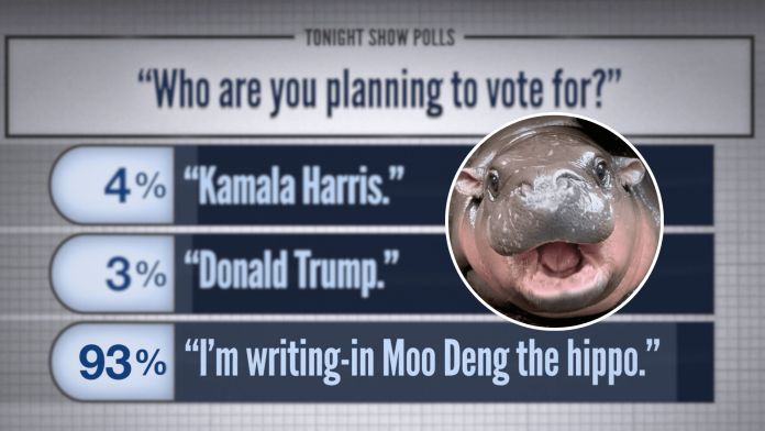 In a lighthearted online poll hosted by a popular U.S. talk show, voters were asked to choose their preferred candidate for the upcoming U.S. presidential election in November. The poll featured former president Donald Trump, Vice President Kamala Harris, and a surprising contender—Moo Deng, a pygmy hippo calf from Khao Kheow Open Zoo in Chonburi, Thailand.