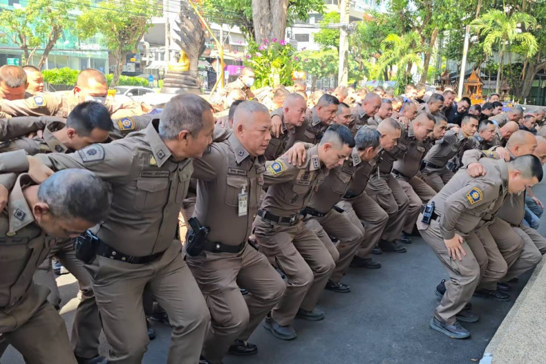 Police officers at Bangkok’s Thong Lor station performed 10 squats as a public act of accountability following an incident involving a drunk colleague. The unusual disciplinary measure came after Pol Sgt Maj Montri Meedetch, under the influence of alcohol, fired a gun during an argument with a bar security guard in the early hours of Sunday.